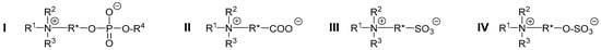 Generalized structure of major polyzwitterion classes. From left to right: Ammonio phosphates (I, specifically for R* = –CH2–CH2–: phosphatidylcholines), ammonio carboxylates (II, carboxybetaines), ammonio sulfonates (III, sulfobetaines), and ammonio sulfates (IV, sulfabetaines).