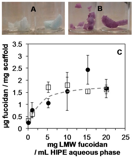 A,B: Scaffold staining (after washing) due to complexation of toluidine blue with LMW fucoidan for the fucoidan concentration in the HIPE aqueous phase (34 mL) of 0 mg mL−1 (A) and 10 mg mL−1 (B). C: Amount of LMW fucoidan immobilized inside scaffolds before (☐) and after washing (●) as a function of the LMW fucoidan concentration in the HIPE aqueous phase.