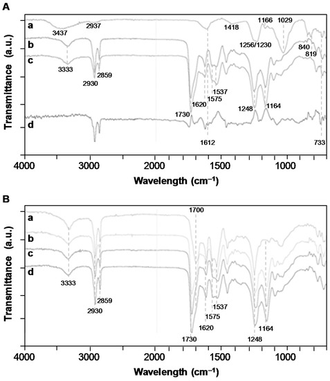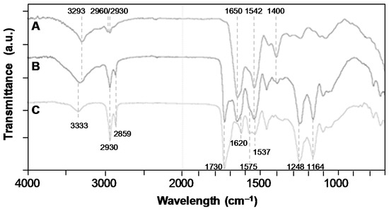 FTIR-ATR spectra of: A/Pure PRP (dry); B/PRP-PEUUF scaffold (dry); C/PEUUF scaffold (the LMW fucoidan concentration in the aqueous phase of the HIPE used for functionalization = 10 mg mL−1; and the PRP concentration used for bio-activation = 15 vol% (16 h of incubation)).