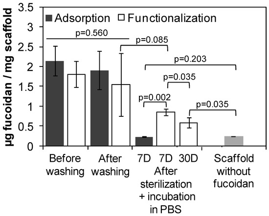 The stability of the functionalization was studied by quantifying the amount of fucoidan remaining inside the scaffold after washing, sterilization and incubation in PBS during 7 days and 30 days (Figure 4). There was no statistically significant difference in the amount of fucoidan between the adsorption and functionalization methods either before or after washing (p = 0.560). No fucoidan remained inside the scaffold after sterilization and 7 days of incubation in PBS when fucoidan was only adsorbed after the scaffold elaboration (p = 0.203 between incubated scaffolds containing adsorbed fucoidan and scaffolds synthesized in an absence of fucoidan). Notwithstanding, the functionalization developed in this study was stable, since no statistically significant difference in the amount of immobilized fucoidan was found after the washing of PEUUF scaffolds and after sterilization and 7 days of incubation in PBS (p = 0.085). After 30 days of incubation in PBS, the amount of immobilized fucoidan slightly decreased (p = 0.035), but was still statistically significantly higher than scaffolds synthesized in the absence of fucoidan (p = 0.035) and scaffolds containing adsorbed fucoidan after sterilization and 7 days of incubation in PBS (p = 0.031).