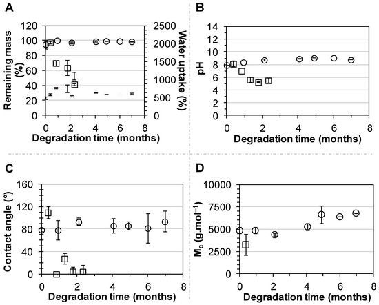 Incubation of PEUUF scaffolds in the degradation medium at 37 °C (○) and 90 °C (☐) over a period of 7 months and 70 days, respectively: (A) Scaffold remaining mass (open symbols) and water uptake (full symbols); (B) Medium pH; (C) Water contact angle; (D) Scaffold number average molecular weight between cross-links . (The LMW fucoidan concentration in the aqueous phase of the HIPE used for functionalization = 10 mg mL−1).