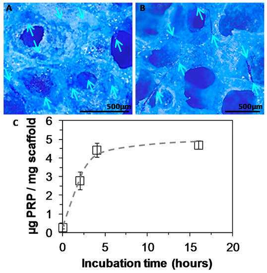 The evidence of PRP immobilization was monitored by FTIR-ATR spectroscopy and by imaging the scaffold stained by Coomassie blue with a digital microscope Keyence VHX-5000. The amount of PRP immobilized inside the scaffold was determined using a 2D Quant kit (GE Healthcare, Chicago, IL, USA).