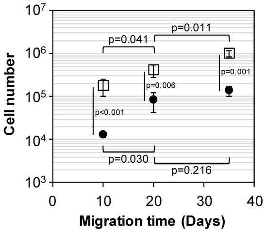 Cell number after 10, 20 and 35 days of fibroblast migration into PEUUF scaffolds (●) and PRP-PEUUF scaffolds (☐) (the LMW fucoidan concentration in the aqueous phase of the HIPE used for functionalization = 10 mg mL−1; the PRP concentration used for bio-activation = 15 vol% (16 h of incubation)).