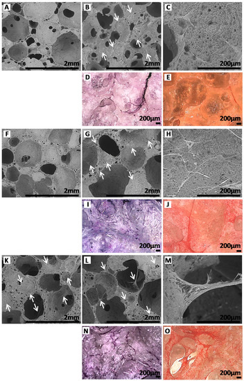 ESEM images of scaffolds after 10 (A,F,K) and 35 (B,C,G,H,L,M) days of fibroblast migration (Arrows indicate some locations of cells in ESEM images). Images after 35 days of fibroblast migration of scaffolds stained with Hemalun (D,I,N) and Sirius red (E,J,O). A,B,C,D,E: Non-functionalized scaffolds synthesized in absence of fucoidan and impregnated with PRP. F,G,H,I,J: PEUUF scaffolds. K,L,M,N,O: PRP-PEUUF scaffolds. (The LMW fucoidan concentration in the aqueous phase of the HIPE used for functionalization = 10 mg mL−1; while the PRP concentration used for bio-activation = 15 vol% (16 h of incubation)).