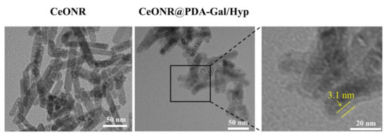 The construction process of CeONR@PDA-Gal/Hyp is illustrated in Scheme 1. First, a dense PDA film was formed on the surface of CeONR through the self-polymerization of dopamine under oxygen and alkaline conditions (pH = 8) [32,33] to obtain CeONR@PDA. PDA film not only endows the system with good biocompatibility and biodegradability under physiological conditions, but also facilitates the secondary modification and provides the possibility of modifying the target molecules to the surface of the nanorods. Thiolated galactose (Gal-SH) was modified onto the surface of CeONR@PDA as a targeting molecule for HepG2 cells. Thereafter, Hyp can be loaded onto the surface of CeONR@PDA-Gal by π–π stacking and hydrogen bonding to overcome the problem of poor solubility of Hyp in an aqueous phase [34,35]. The size and morphology of CeONR and CeONR@PDA-Gal/Hyp were revealed by TEM (Figure 1). A layer with a thickness of 3.1 nm was observed on the surface of CeONR@PDA-Gal/Hyp, which indicated that PDA was successfully coated on the surface of CeONR. The average length and diameter of CeONR@PDA-Gal/Hyp, 61 ± 0.9 nm and 12.5 ± 1.2 nm, respectively, were statistically obtained using Image-Pro Plus software (n = 100).