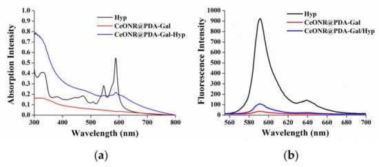 (a) UV-Vis spectra and (b) fluorescence spectra of Hyp, CeONR@PDA-Gal, and CeONR@PDA-Gal/Hyp in methanol. The amount of Hyp in CeONR@PDA-Gal/Hyp was the same as that in the methanol solution of Hyp.
