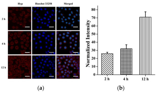 To assess the uptake capacity of HepG2 cells to CeONR@PDA-Gal/Hyp, CeONR@PDA-Gal/Hyp (0.25 μM Hyp, 0.5 μg/mL CeONR) was co-cultured with HepG2 cells for 2, 4, and 12 h, respectively. Initially, the fluorescence of Hyp on CeONR@PDA-Gal/Hyp was quenched by PDA [36]. Once Hyp is released, the fluorescence of Hyp will be restored. Therefore, CLSM was used to observe the change of Hyp fluorescence with incubation time, which further indirectly revealed the release of Hyp. The fluorescence of Hyp increased with the prolongation of incubation time (Figure 3a), which indicates CeONR@PDA-Gal/Hyp was efficiently taken up by HepG2 cells and Hyp was released slowly after the nanorods entered the cells. Considering the release rate of Hyp at a low pH is relatively low (Figure S2), we speculate that there may be some other unknown stimuli that contributes to the release of Hyp under the intracellular environment. Furthermore, the CLSM data were semi-quantitatively analyzed by Image-Pro Plus software (Figure 3b). The trend of fluorescence changes in Figure 3a matched well with the calculated results, and the histogram distinctly showed the amount of Hyp entering the cells that increase with time, from 2 h to 12 h.