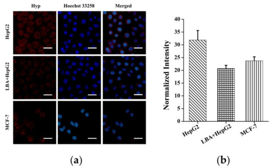 The surface of HepG2 cells contains overexpressed asialo-glycoprotein receptors (ASGP-R), which can be specifically recognized by D-(+)-Galactose [38]. Therefore, Gal-SH, a derivative of D-(+)-Galactose, was synthesized and used to modify the surface of nanorods to endow their ability to target HepG2 cells. To evaluate the targetability of CeONR@PDA-Gal/Hyp, HepG2 cells and MCF-7 cells were co-cultured with CeONR@PDA-Gal/Hyp for 4 h, and the target effect of CeONR@PDA-Gal/Hyp was evaluated by CLSM. As shown in Figure 4a, the fluorescence of Hyp in HepG2 cells was relatively stronger than that in MCF-7 under the same conditions. This is due to MCF-7 cells have relatively lower ASGP-R expression on their membrane surface in comparison with HepG2 [39]. To further prove the function of D-(+)-Galactose in facilitating the cellular uptake by specifically recognizing ASGP-R receptors, HepG2 cells were pretreated with lactobionic acid (LBA) for 4 h. The fluorescence of Hyp observed, thus, was clearly weaker when compared with that in non-pretreated HepG2 cells, and similar to that in MCF-7. The pathway of CeONR@PDA-Gal/Hyp entering HepG2 cells mainly relied on the active targeted transport of ASGP-R regulation, which enhanced the cellular uptake of CeONR@PDA-Gal/Hyp. The galactose receptor of HepG2 can be blocked by pretreating the cells with LBA, which inhibits the active targeted transport pathway. CeONR@PDA-Gal/Hyp was taken up by HepG2 cells pretreated with LBA and MCF-7 cells mainly via non-specific endocytosis. Therefore, intracellular fluorescence was relatively weak. Meanwhile, the CLSM data were semi-quantitatively analyzed using Image-Pro Plus software (Figure 4b), where a similar profile of fluorescence intensity was obtained.