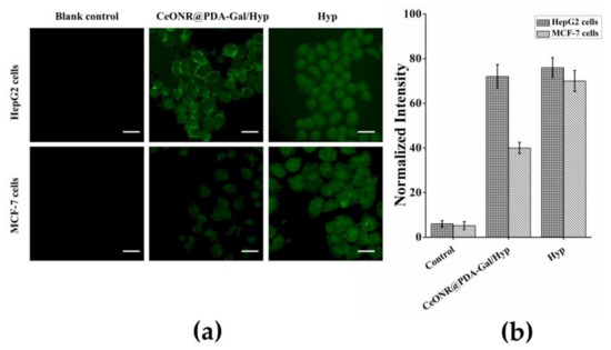 It has been reported that Hyp can induce apoptosis under light conditions, mainly due to the activation of the mitochondrial apoptotic pathway by ROS produced by a photoreaction [40]. Therefore, for PDT, the amount of ROS in the cells is one of the important factors for examining the photodynamic effect. DCFH-DA was used as an ROS fluorescent indicator to examine the amount of intracellular ROS. DCFH-DA does not fluoresce in the cell, but it can be hydrolyzed by intracellular esterase to form DCFH, which can then be oxidized by ROS to form DCF, which emits green fluorescence upon excitation by a 488-nm wavelength. Therefore, the fluorescence intensity of DCF is directly proportional to the amount of ROS in the cells. The results were shown in Figure 5a, where it could be seen that the green fluorescence in the PBS-treated control group was neglected, while the fluorescence in HepG2 cells and MCF-7 cells treated with Hyp and irradiated with a 590-nm light source for 30 min was strong with a similar intensity. However, under the same conditions, when CeONR@PDA-Gal/Hyp was co-cultured with HepG2 cells and MCF-7 cells for 4 h, the fluorescence intensity in HepG2 cells was significantly stronger than that in MCF-7 cells. The results not only proved that CeONR@PDA-Gal/Hyp could enter HepG2 cells and achieve an ideal photodynamic effect under irradiation, but also further demonstrated the targeting ability of CeONR@PDA-Gal/Hyp to HepG2 cells. Further, the fluorescence microscopy data were semi-quantitatively analyzed using Image-Pro Plus software (Figure 5b), which clearly showed CeONR@PDA-Gal/Hyp could not only produce a larger amount of ROS in HepG2 cells than in MCF-7 cells, but also the ROS yield was almost the same as that of free Hyp.