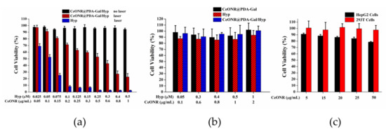 (a) The cell viability of HepG2 cells, which were co-cultured with Hyp and CeONR@PDA-Gal/Hyp (Hyp 0.025–0.5 μM) for 4 h, respectively, irradiated with a 590-nm light source (8.6 mW/cm2) for 30 min, and then cultured for 24 h in the dark. HepG2 cells co-cultured with CeONR@PDA-Gal/Hyp at the same concentrations for 28 h in the dark were used as control. (b) The cell viability of 293T cells treated with different concentrations of free Hyp, CeONR@PDA-Gal, and CeONR@PDA-Gal/Hyp, respectively, without laser exposure for 24 h. (c) The cell viability of HepG2 cells and 293T cells treated with CeONR@PDA-Gal at various doses (CeONR 5–50 μg/mL) without laser irradiation.
