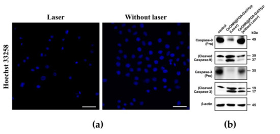 To further examine the effect of drug-induced apoptosis of tumor cells, levels of the two key ingredients of the apoptotic pathway were analyzed by using Western blot. As shown in Figure 7b, Caspase-9, as an essential initiator caspase of the intrinsic apoptotic pathway, was activated after light treatment. Caspase-3, as a downstream target of activated Caspase-9, was also activated by photo induction. These data confirmed that light induced a significant increase of apoptosis compared to the controls.