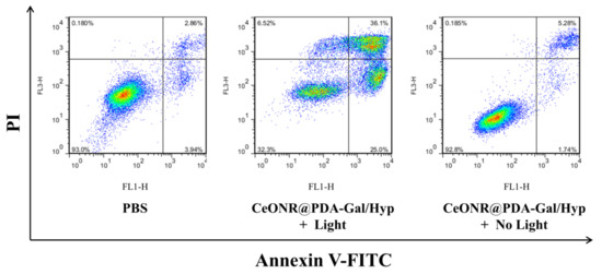 Additionally, the photodynamic therapy effect of CeONR@PDA-Gal/Hyp on HepG2 cells was investigated with Annexin V conjugate staining assay. As shown in Figure 8, the cell death when treated without laser was 6.70%, whereas, with laser irradiation, the cell death increased to 61.10%. Taken together, it appeared that CeONR@PDA-Gal/Hyp could effectively induce apoptosis of HepG2 cells with laser irradiation, while the toxicity to HepG2 cells was weak without irridiation.