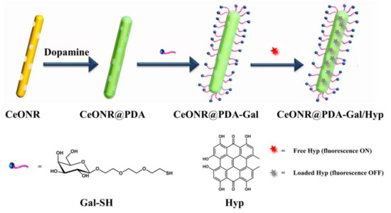 In this work, polydopamine (PDA), as a widely applied biomimetic material with unique properties such as the universal adhesion property, excellent biocompatibility, and biodegradability [28], was coated on the surface of cerium oxide nanorods (CeONR) in situ via self-polymerization of dopamine, which acted as a basic skeleton. Thereafter, the catechol functional group on the surface of CeONR@PDA can be oxidized to quinone, which can easily undergo Michael addition reaction and Schiff base reaction with sulfhydryl and amino compounds [29]. Thiolated galactose, as a targeted unit of human hepatoma HepG2 cells, was further modified through the Michael addition reaction to construct a new type of photosensitizer delivery system (CeONR@PDA-Gal), which could be used to load Hyp onto its surface. We expect this novel platform will not only overcome the problems resulting from the hydrophobicity of Hyp, but also show excellent biocompatibility and photodynamic effect.