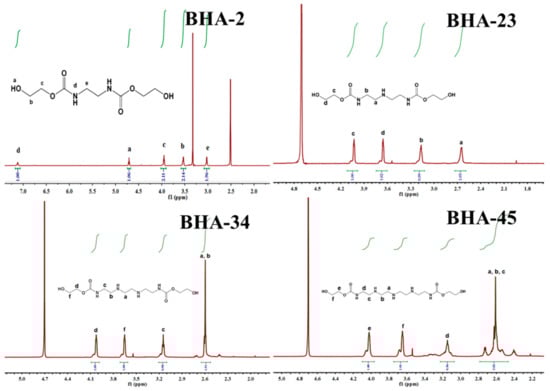 Few reports have described the synthesis of BHAs, especially utilizing polyene polyamine. In this section, four BHAs were first obtained via ring opening reaction and confirmed by NMR, FTIR, and FTMS. In Figure 1, because of the different solubility of BHAs, the Figure shows that the dissimilar solvent peak: δ (ppm) = 2.50 (DMSO-d6, solvent peak) and 3.30 (H2O, water peak) belonged to Figure 1a; δ (ppm) = 4.70 (D2O, solvent peak) belonged to Figure 1b–d. Figure 1 shows the chemical shift of different hydrogen atom, and confirmed successful synthesis of the four BHAs.
