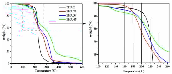 Figure 3 provides the TGA curves of the BHAs. When the temperature exceeded 180 °C, there was a sharp decrease in the weight loss of the four BHAs. Thus, In consideration of the decomposition and reactivity of the BHAs, 180 °C would be an appropriate temperature for the synthesis of a NIPU-prepolymer.