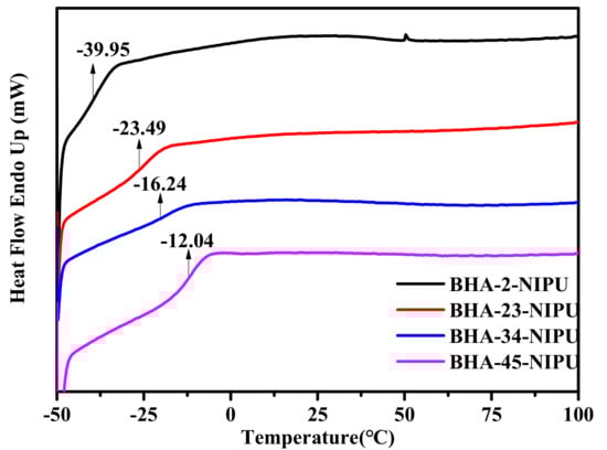 The glass transition temperatures of the four NIPU-prepolymers were determined by DSC, and the results were displayed in Figure 6. It can be seen that there was only one Tg in every DSC curve, indicating that all NIPU-prepolymers were a homogeneous phase system. The results also showed that all Tg of NIPU-prepolymers were blew zero, and the NIPU-prepolymers formed a viscous flow state, which is ascribed to their low relative molecular weight. In addition, because the significant influence of free hydrogen from the secondary amine number could facilitate the formation of more hydrogen bonds, the Tg of the NIPU-prepolymers increased as the secondary amine number increased.