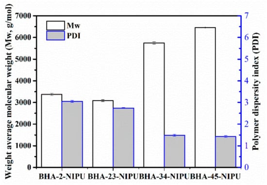 Gel permeation chromatography (GPC) was applied to measure the weight average molecular weight (Mw) and polymer dispersity index (PDI), and the results are shown in Figure 7. The Mw of BHA-45-NIPU reached 6460 g/mol, which was the highest. The Mw of BHA-23-NIPU was almost as low as that of BHA-2-NIPU. According to the research, the secondary amine could facilitate polycondensation. One possible reason for this result is that the secondary amine is alkaline and easily reacted with acid as a first process. The trend of PDI also could be explained by the above reason.