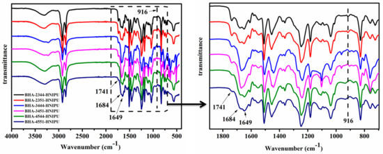 The main purpose of Figure 8 was to indicate whether the reaction was complete, according to the presence of the peak at 916 cm−1 (epoxy group). It can be found that BHA-2344-HNIPU and BHA-2351-HNIPU have residual epoxy groups, mainly because o the low content of secondary amines, which led to lower reaction sites with epoxy groups. In contrast to Figure 4, the band intensity of the vibration peak at 1741 cm−1, which belongs to C=O (carboxyl groups), showed an obviously reduction. This result might boil down to the reaction between the carboxyl groups and the epoxy group. The vibration peaks at 1684 cm−1 and 1649 cm−1 were attributed to the urethane groups and ester groups, respectively. Compared with Figure 4, the C=O vibration peak at 1691 cm−1 shifted to lower wavenumbers of 1684 cm−1, which indicated that the epoxy group provided additional hydrogen bonding for HNIPU [42,43]. Further, Scheme 4 showed the additional hydroxyl groups because of the ring opening of epoxy groups, which could lead to more hydrogen bonding.
