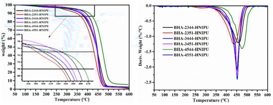 Figure 9 shows the thermal stability of HNIPUs. According to the partial enlargement of TGA curves, the varied trend affected by secondary amine was consistent with Figure 5, illustrating that thermal stability was mainly affected by the content of the secondary amine. In other words, after reacting with epoxy groups under the condition of the programmed temperature, the chemical bond from the secondary amine still had a good thermal stability and a dominant role. Meanwhile, the E-44 with the lower epoxy value provided better thermal stability than E-51, based on the results of Figure 9 (left). This phenomenon could be explained by the greater number of hydroxyl groups in the structure of E-44, which could influence the hydrogen bond or crosslinking degree. In Figure 9 (right), the BHA-4544-HNIPU clearly had the highest maximum decomposition rate and the BHA-2351-HNIPU had the lowest maximum decomposition rate.