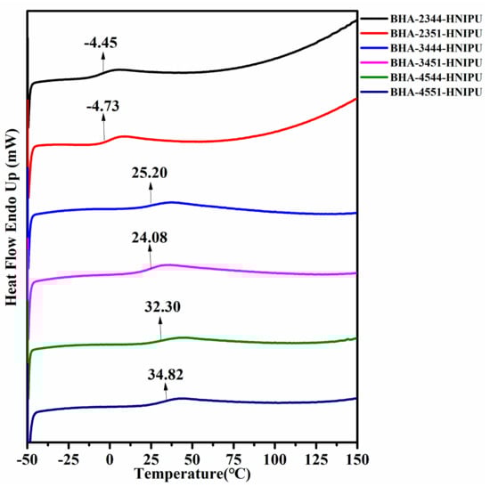 As the only secondary amine in BHA-23, the crosslinking degree was naturally low in BHA-2344-HNIPU and BHA-2351-HNIPU. Therefore, these two HNIPUs showed a viscous flow state instead of an elastomeric state at room temperature, and this result was represented in Figure 10. The glass transition temperature (Tg) is affected by many different parameters, such as intermolecular interactions, molecular symmetry, chain stiffness, type of aside group, branching/crosslinking density, and molar mass [44]. In this study, we found that secondary amine content played a bigger role in influencing Tg than the epoxy value. The BHA-4551-HNIPU had the highest Tg (34.82 °C) in all HNIPUs. The main reason for this result could be its high crosslinking degree, especially the greater number of sites of crosslinking from the secondary amine.