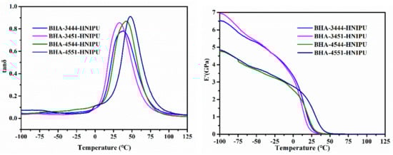 The storage modulus E’ was used to illustrate the rigidity of material. The storage modulus of BHA-3444-HNIPU and BHA-3451-HNIPU were higher than those of BHA-4544-HNIPU and BHA-4551-HNIPU before 13 °C, which could be attributed to the crystallization behavior of these two HNIPUs. However, BHA-4551-HNIPU had the highest storage modulus after 13 °C, and the other three HNIPUs just had a tiny difference. This result shows that the BHA-4551-HNIPU had the best rigidity of all HNIPUs after 13 °C, and demonstrates that the crosslinking degree was important for the storage modulus.
