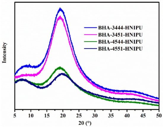In order to understand the crystallization behavior of the HNIPUs, XRD analysis was necessarily investigated. As seen in Figure 13, there were no prominent diffraction peaks, and this result indicates that BHA-4544-HNIPU and BHA-4551-HNIPU were structurally amorphous. However, BHA-3444-HNIPU and BHA-3451-HNIPU might form crystallization, which could be explained by the lower secondary amine content and lower crosslinking degree. Therefore, the crystallization behavior of HNIPUs could be tailored based on the secondary content.