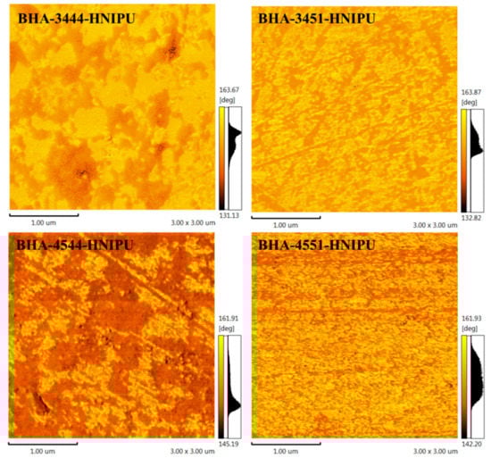 AFM was an appropriate morphological surface characterization method for studying the nanophase separation of HNIPUs. As shown in Figure 14 of BHA-3444-HNIPU, BHA-3451-HNIPU and BHA-4544-HNIPU, the two phases (the bright domain represents the soft segment and the dark domain represents the hard segment) were apparently heterogeneous, especially for BHA-3444-HNIPU and BHA-4544-HNIPU; in other words, the E-44 had a larger impact on nanophase separation than E-51. Furthermore, amine type played a less important role than epoxy value because it could only determine the hard segment, and BHA-4551-HNIPU naturally had the best microphase separation (seen in Figure 14 of BHA-4551-HNIPU). For this reason, BHA-4551-HNIPU showed wonderful thermodynamic properties as a result of the TGA and DMA shown.