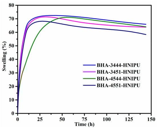 Swelling was also an instruction of the crosslinking degree for HNIPUs. In this study, DMSO was chosen as a solvent, which cannot dissolve these polymers and just makes them swell. As Figure 16 shows, BHA-4551-HNIPU had the greatest swelling in these four HNIPUs, which indicates that it has the highest crosslinking degree. Meanwhile, the epoxy value was a more critical influence than the secondary amine content on swelling. In other words, the epoxy value had a noticeable impact on crosslinking degree instead of secondary amine content. The greatest swelling of the HNIPUs was less than 70%, which suggests that its environmental stabilities might be reasonably good.