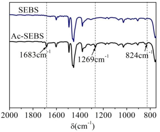 Fourier Transform Infrared Spectroscopy (FTIR) spectra of polystyrene-b-poly(ethylene-co-butylene)-b-polystyrene (SEBS) and Ac-SEBS.