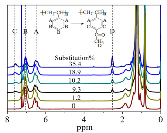 Figure 2 shows the 1H NMR spectra of SEBS and Ac-SEBS with different degrees of acetylation. The proton resonance of the benzene rings in SEBS and Ac-SEBS generally occurs in three regions (A, 6.3–6.8 ppm; B, 6.8–7.2 ppm C, 7.35–7.8 ppm). Region A corresponds to the absorption peak of the neighboring proton of the benzene ring in SEBS and Ac-SEBS; Region B corresponds to the absorption peak of the meta and para protons of the benzene ring in SEBS; and Region C corresponds to the peak formed by the migration of the absorption peaks of two protons adjacent to the carbonyl group towards the high field following the π–π conjugate between the acetylated benzene ring and carbonyl. The new peak appearing at 2.4–2.6 ppm is the proton peak of CH3 of the acetyl group. Since the area of the resonance peak in the 1H-NMR spectrum is proportional to the number of protons that produce the peak, we can calculate the degree of acetylation of SEBS from the ratio of the proton peak areas. The number of protons represented by A does not change with the acetylation reaction of SEBS, whereas the number of protons represented by D increases with the degree of acetylation. The ratio of the area of peak A to the area of peak D can be used to calculate the degree of acetylation of SEBS. The degree of acetylation of the sample was therefore calculated using Equation (2):