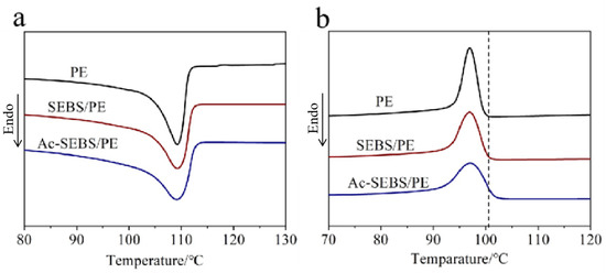 (a) Melting curves and (b) crystallization curves of PE, SEBS/PE, and Ac-SEBS/PE.