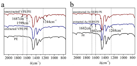 The stability of the samples was analyzed by comparing the infrared spectra of the samples before and after extraction. Figure 5a is infrared spectrum pre-and post-extraction of 1-(4-vinyloxy)phenylethenone (VPE)/PE blends. It can be seen from Figure 5a that the characteristic absorption peaks of VPE at 1687 cm−1, 1599 cm−1 and 1244 cm−1 can be seen in the infrared spectra of VPE/PE sample before extraction. The characteristic absorption peaks of VPE disappeared in the infrared spectra of VPE/PE sample after extraction. This indicates that the free VPE was removed from PE after extraction. As shown in Figure 5b, the characteristic absorption peaks of AP in Ac-SEBS/PE at 1682 cm−1, 1602 cm−1 and 1268 cm−1 hardly changed pre-and post-extraction. This proves that AP is stable in Ac-SEBS/PE.