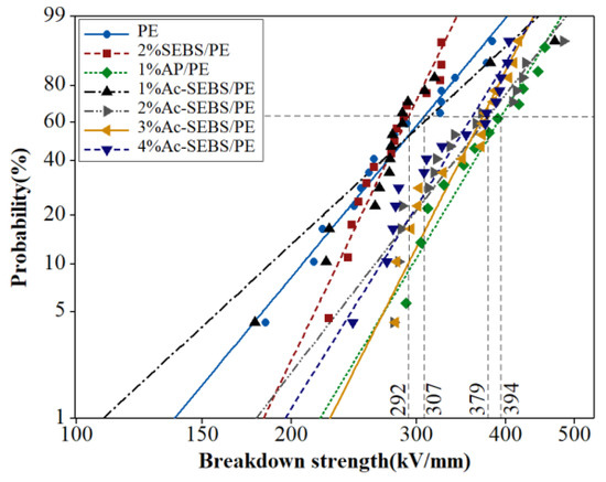 Weibull plots of the DC breakdown strength of Ac-SEBS/PE with different contents of Ac-SEBS.