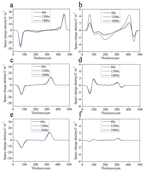 Space charge accumulation is an important factor causing insulation failure in DC cables; therefore, the space charge accumulation in insulation should be as low as possible. Figure 9 shows the space charge distribution and short circuit conditions of PE, 2% SEBS/PE, and 2% Ac-SEBS/PE. It is noted from Figure 9a that a large number of charges are injected near both the cathode and anode in PE. In comparison, Figure 9c,e show that the numbers of injected charges in SEBS/PE and Ac-SEBS/PE are significantly lower than that in PE, especially in Ac-SEBS/PE, where almost no charges exist near the cathode and anode.