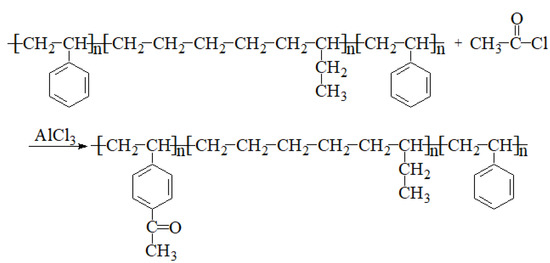 Polystyrene-b-poly(ethylene-co-butylene)-b-polystyrene (SEBS) exhibits good compatibility with PE and has been studied as a dispersant and toughening agent for the modification of polyolefin insulation materials [34,35,36,37]. Ma et al. [38] studied the electrical, mechanical, and growth behavior of a water tree in SEBS/crosslinked polyethylene (XLPE) composites. The results show that the addition of SEBS can significantly improve the inhibition effect and mechanical properties of an XLPE water tree, but the breakdown strength is decreased by some degree. If SEBS is combined with a voltage stabilizer, not only can the small-molecule voltage stabilizers be inhibited from migrating in the PE matrix, but the voids generated in the PE insulating material due to volatilization during processing and crosslinking of the small-molecule voltage stabilizers can also be avoided. In this study, acetophenone structural units were produced in SEBS by the acetylation reaction, and PE was modified by acetylated SEBS (Ac-SEBS), The acetophenone functional unit has the effect of voltage stabilization, which improves the DC breakdown strength of the composites. As a polar group, the acetophenone functional unit can introduce deep traps in the composites and inhibit the accumulation of space charge in the composites.