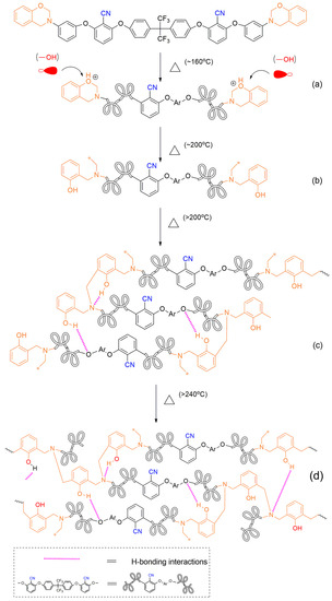 - Zhao, P.; Liang, X.; Chen, J.; Ran, Q.; Gu, Y. Poly(ether imide)-modified benzoxazine blends: Influences of phase separation and hydrogen bonding interactions on the curing reaction. J. Appl. Polym. Sci. 2013, 128, 2865–2874. [Google Scholar] [CrossRef]
