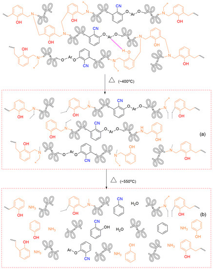 - Xu, M.; Ren, D.; Chen, L.; Li, K.; Liu, X. Understanding of the polymerization mechanism of the phthalonitrile-based resins containing benzoxazine and their thermal stability. Polymer 2018, 143, 28–39. [Google Scholar] [CrossRef]