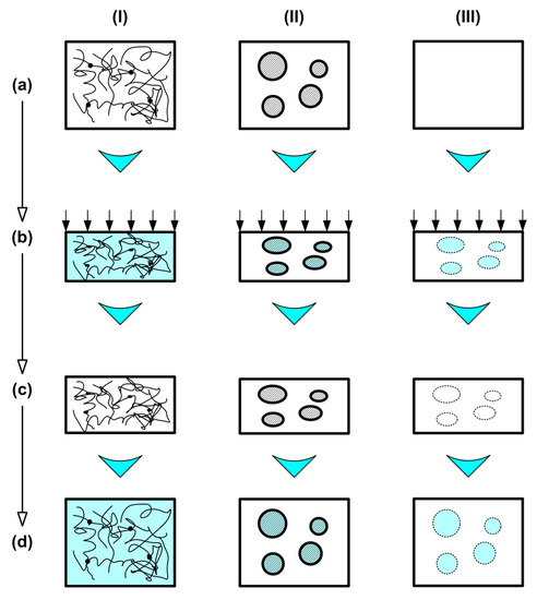 Basic working mechanisms for the heating-responsive SME in polymeric materials. (I) Dual-state mechanism (DSM); (II) dual-component mechanism (DCM); (III) partial-transition mechanism (PTM). (a) Original sample at room temperature; (b) upon heating and compressing; (c) after cooling and constraint removal; (d) after heating for shape recovery. (Modified from Reference [12]).