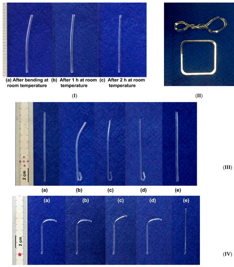 Shape recovery in poly(methyl methacrylate) (PMMA) via different ways of pre-deformation. (I) Relaxation in slightly bent (at room temperature) sample. (II) Heating-responsive shape memory effect (SME) in sample programmed at high temperatures (above Tg). Top: after programming; bottom: after heating. (III) Comparison of the influence of programming conditions on recovery upon heating. (a) Original shape; (b) after bending (bottom part: bent above Tg, top part: bent in 95 °C water); (c) after heating in 90 °C water; (d) after heating in 98 °C water; (e) upon further heating to over Tg. (IV) Triple-SME. (a) After heating to above Tg and bending down; (b) heating in 98 °C water; (c) bending upon slightly in 98 °C water; (d) heating in 98 °C water; (e) heating to above Tg. ((a–c) is the programming process, (d–e) is the recovery process.) [(III) and (IV) are reproduced from Reference [30] with permission].