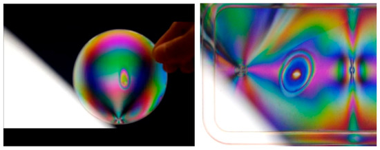 Heating to alter the color pattern observed via photo-elasticity. (Left) plastic petri dish; (right) PP box (cover). The circular/elliptical areas are produced by local heating to alter the internal stress induced by injection molding.