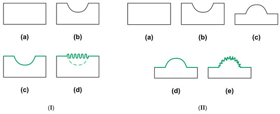 According to Reference [1], a shape memory composite should have at least one component with the SME. Two typical concepts of elastic coating atop a polymer are illustrated in Figure 4. In Figure 4I, the surface of a piece of polymer (Figure 4I(a)) is impressed to form an indent (Figure 4I(b)). Subsequently, a layer of thin elastic film (e.g., Au) is coated atop (Figure 4I(c)). After heating for shape recovery, wrinkles are formed within the indented area, which at a macroscopic scale, is now a flat surface due to the SME (Figure 4I(d)). Structural coloring effect [58,59] may be observed, if the wavelength and magnitude of the wrinkles are optimized [13,60]. However, as mentioned above, if the coating is brittle and the recovery strain of the underneath polymer is too big, cracks may be resulted in the direction perpendicular to the wrinkles [61]. An effective way to get rid of this cracking problem is to have the same polymer coated atop [62,63]. In Figure 4II, after impression to form an indent atop a piece of polymer, its surface is polished to fully or partially remove the indent. Thus, after heating, a protrusion is formed (Figure 4II(c)) [64]. After coating (Figure 4II(d)) and then heating, wrinkles are formed on the surface of the protrusion (Figure 4II(e)) [65]. The formation of such wrinkles requires higher heating temperature and the exact temperature required for wrinkling is a function of the radius of the protrusion [61], which might be utilized to monitor over-heating temperature.