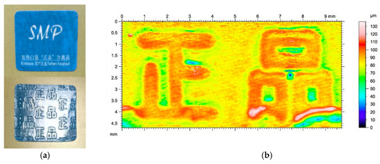 Typical anti-counterfeit shape memory polymers (SMP) label (0.16 mm thick) available in the market (from Guangzhou Manborui Material Technology Co., Ltd., Guangzhou, China). (a) Top: before heating (as received); bottom: after heating in an oven at 65 °C for two minutes. (b) 3D surface scanning result (using Taylor scanner), which reveals that the surface feature after heating for shape recovery is about 100 μm in height.