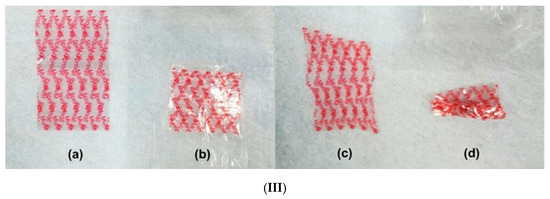 Probably the top two most successful commercial SMP products at present are heat shrink tubes for protection of cables/wires and heat shrink films (membranes) for label and packaging. Although different types of polymers are used, mostly they are cross-linked via irradiation. In Figure 6II, the right end of a piece of heat shrink tube, which is made of cross-linked EVA, is heated to over 80 °C, which is above its Tg [26], so that this part shrinks remarkably. Figure 6III(a) is a piece of commercial heat shrink label (with screen-printed protruding oil on one side of its surface), and Figure 6III(b–d) present the shapes of the labels after heating under three different restrained conditions, from free-standing to restrained between two rigid plates clipped together. After heating for shrinkage of the label, strip-wrinkles are formed in the area coated with protruding oil due to buckling. Consequently, if the label is heated for free recovery [i.e., without any restraint as in Figure 6III(d)], instability in the form of a combination of local buckling (wrinkling) and global buckling is resulted.