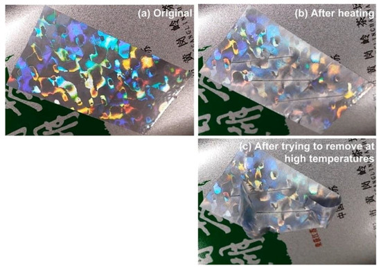Cracking in hologram sticker upon heating. (a) Original label, in which no apparent crack can be observed and the color appears vivid; (b) after heating by hair dryer, cracks are apparent and the color turns dull; (c) removal at high temperatures results in tearing of the label.