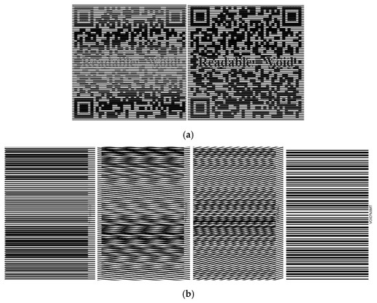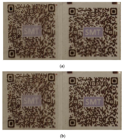 Anti-heat transfer quick response (QR) code. Left: modified label; right: without modification which is always readable. (a) Before heating, both are quickly readable by smartphone; (b) after heating, the left is unreadable or takes much longer time to read, while the right is still quickly readable as before.