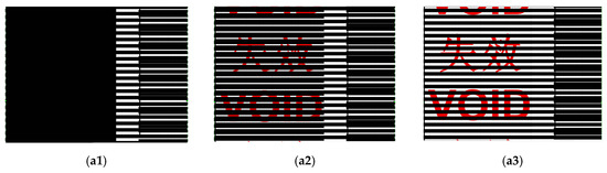 Anti-heat transfer quick response (QR) code (a) and barcode (b). (a) Left: before heating (unreadable); right: after heating (readable to show void). (b) Left three: before heating (unreadable); right: after heating (readable to show void).