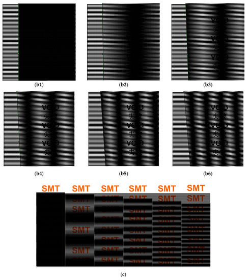 Stripe interference between two layers with patterns printed atop (Moiré pattern) is another possible application using SMP to produce the moving effect during heating induced shape recovery. Three examples are illustrated in Figure 9. In Figure 9a, upon step-by-step heating, the top layer, which is transparent, moves up gradually, while in Figure 9b, upon heating, the top transparent layer rotates slightly. Figure 9c is different from above two cases, as the top layer shrinks upon heating. A closer look reveals that there is a fixed relationship between the number of black bands and the actual strain due to shrinkage. Hence, after calibration, this phenomenon may be used in strip shaped temperature sensors to monitor the maximum heating temperature.