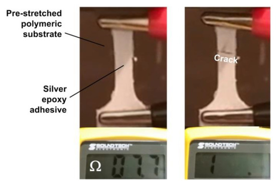 Above mentioned heating-then-cracking function has been integrated into an electrical circuit. Thus, if over-heated, the circuit breaks, as demonstrated in Figure 11, in which silver epoxy adhesive is coated atop a piece of pre-stretched polymeric substrate with a narrow crack produced by a sharp blade.