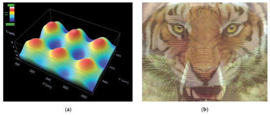 To increase the difficulty in replication, it might be designed in such a way that upon heating, the pattern of a special micro protrusion array on one side of a plastic film disappears, so that the underneath printed pattern on the other side loses the 3D effect. In Figure 13a, the micro lens array is produced atop a piece of pre-compressed optical polymer film using laser through a micro lens for heating of the required locations only. Such a micro lens array effect has been applied to realize 3D with naked eyes. The underneath image is specially designed to have more than one pictures integrated together (e.g., in Figure 13b). Through this micro lens array, from different viewing angles, we see different individual images (e.g., elephant or tiger in Figure 13b). If the surface becomes smooth upon heating, the image appears as a mixture of elephant and tiger. The difficulty to perfectly match the image on one side to the micro lens array on the other side is a big technical challenge, if anyone attempts to reproduce the 3D effect in a cost-effective way. Customized feature, which appears upon heating, may be produced by 3D printing as an additional security measure [79]. In Reference [15], it is reported to use SMP as a platform to integrate shape memory function and photo-imaging together for high-security information storage.