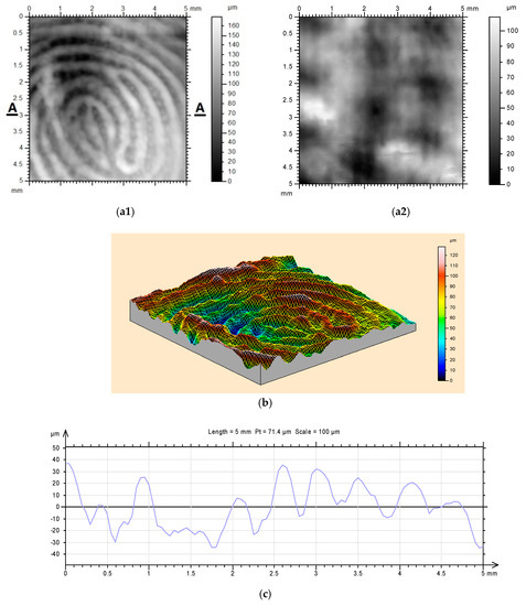 3D finger-print (2% cross-linked poly-ε-caprolactone (PCL). (a) Top view of 3D scanning result. (a1) After finger impression; (a2) after heating, the finger-print disappears. (b) 3D finger-print. (c) A-A section of finger-print.